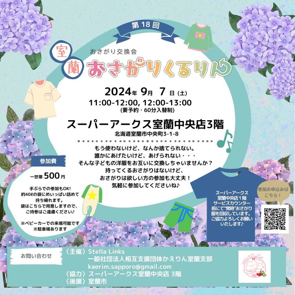 最初は札幌で始まったおさがりくるりんも、今は各地に少しずつ広がり、室蘭では、2021年9月から開催し、開催回数は20回を超えており、今では参加される世帯も多く、来場者は200名程となっています。