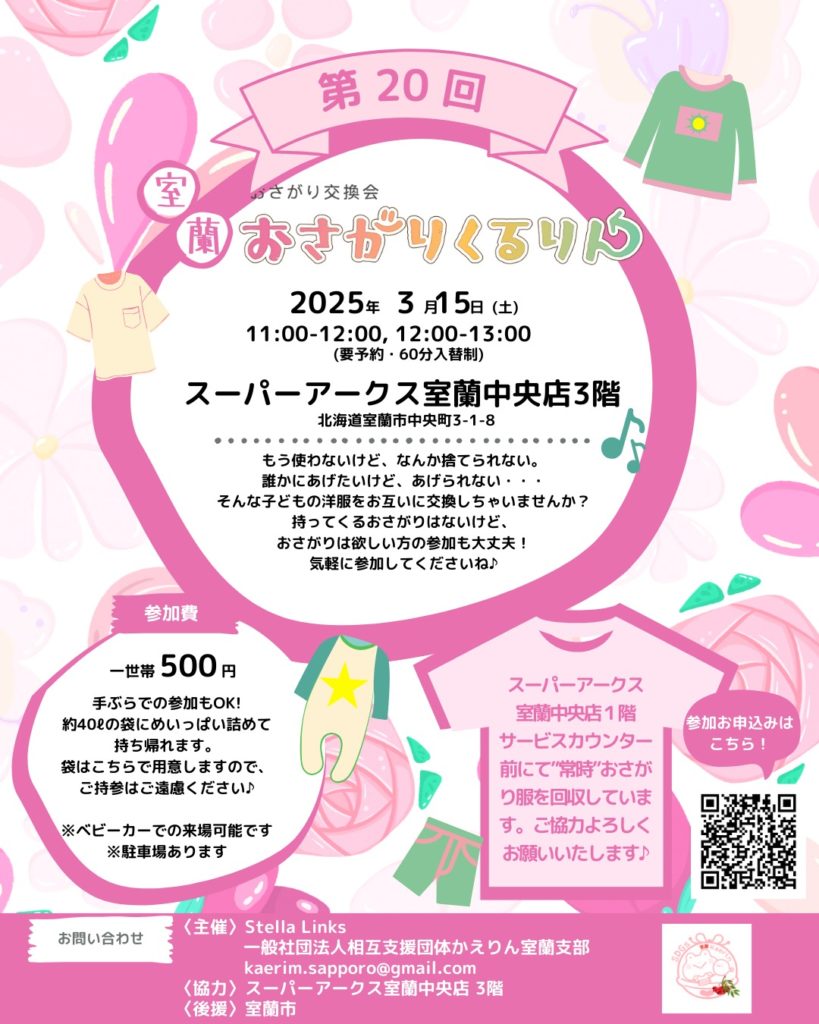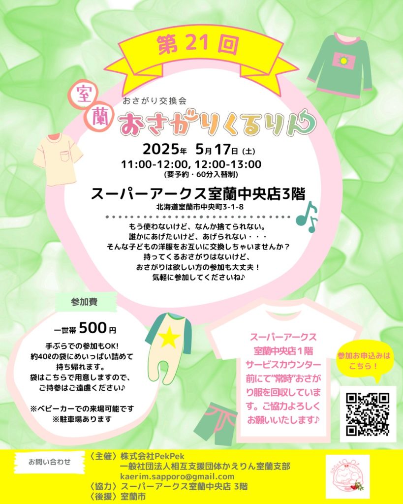 スーパーアークス室蘭中央店1階サービスカウンター前にて、おさがり服常時回収中です。